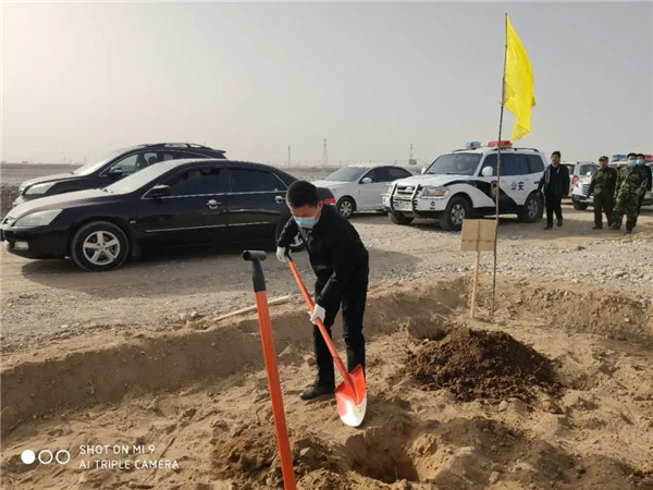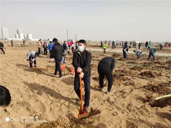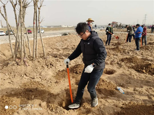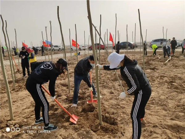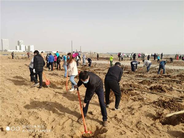 植树现场,大家个个态度积极、热情高涨,兴致勃勃地投入到植树活动中,大家有的扶苗,有的培土,各个环节衔接有序,配合默契,充分发扬了团结、互助、友爱的精神。经过一上午的挥汗奋战,近200多株杨树和刺槐整齐的栽到了戈壁上,在四月的阳光中奏响绿色的希望,圆满完成了这次植树任务。