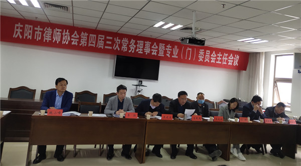 2020年4月18日,庆阳市律师协会四届三次常务理事会暨专业(门)委员会主任会议在市人防司法大厦13楼会议室召开。会议由会长吕民国主持,副会长马成祯、吴建东、闫琳、李灏及其他8名常务理事(请假2名)和各专业(门)委员会主任参加会议。监事会副监事长刘华到会监督。律协秘书长高永祯、副秘书长李永盛、李姿霖、杨静列席会议。