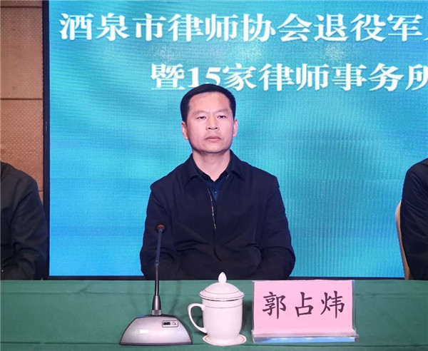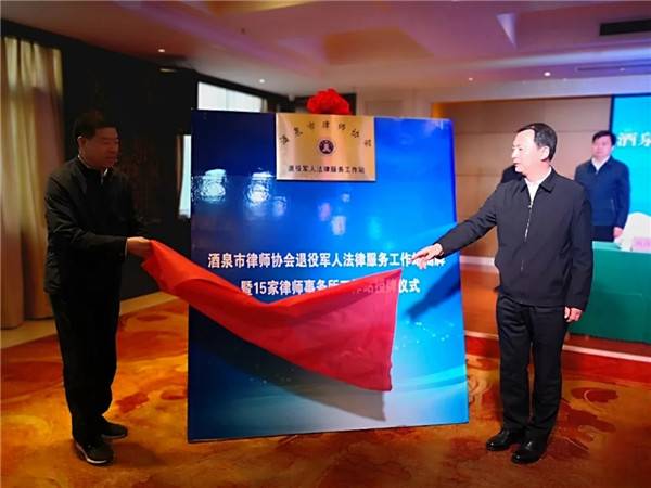 省退役军人事务厅党组成员、副厅长崔进泰、酒泉市政府副市长赵志刚共同为酒泉市律师协会退役军人服务工作站进行了揭牌,与会领导分别为酒泉阳关律师事务所等15个律师事务所退役军人法律服务工作站进行了授牌。
