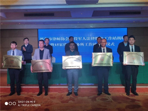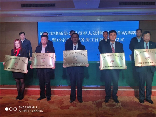 与会领导为酒泉阳关律师事务所等15个律师事务所退役军人法律服务工作站授牌