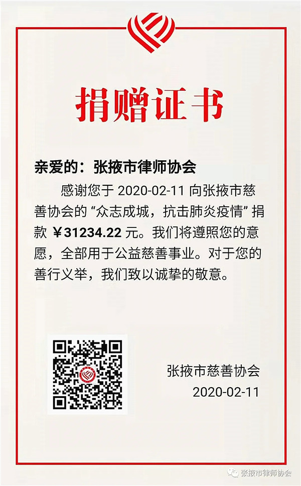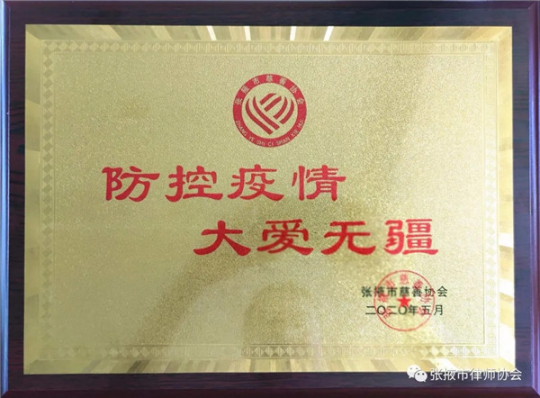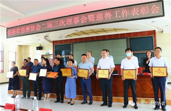 会上,对抗击疫情慈善捐赠中表现突出的先进单位和个人进行了表扬通报,张掖市律师协会荣获“防控疫情,大爱无疆”荣誉称号,并增补为张掖市慈善协会单位会员,杨发军律师增补为张掖市慈善协会理事。