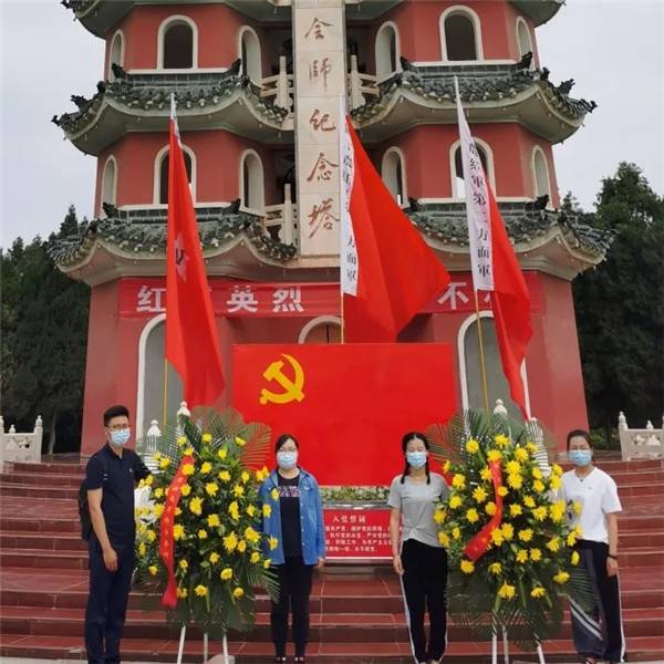 在巍巍会师纪念塔前,全体人员肃立,奏唱国际歌,重温入党誓词,向英勇献身的烈士鞠躬致敬、敬献花篮,以表达对革命圣地和革命先烈的敬仰之情。