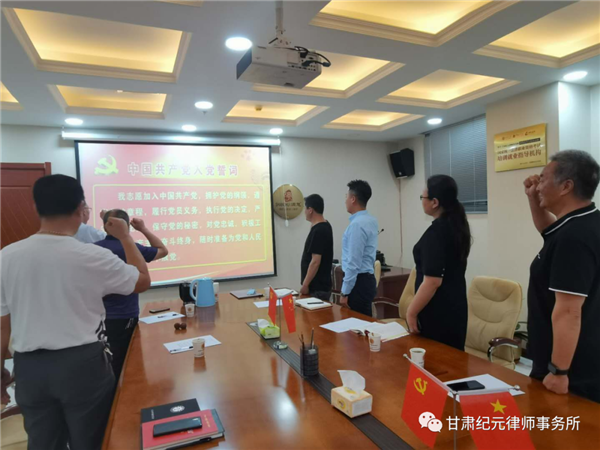 为献礼中国共产党建党99周年,充分调动律师党员干部的活力与凝聚力,有效发挥党建在律所的引领作用,2020年7月1日,中国共产党甘肃纪元律师事务所党支部开展了主题党日活动。本次主题党日活动,首先由杨永明书记带领全体党员、预备党员重温入党誓词,庄严宣誓。