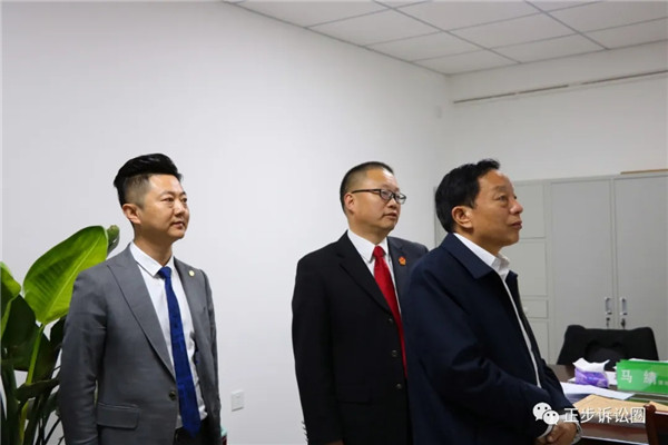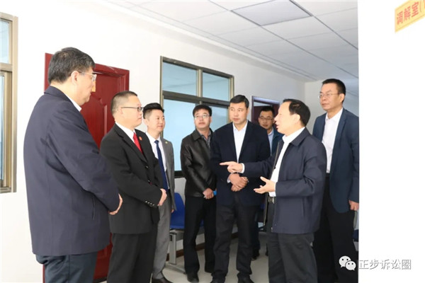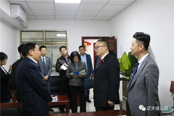 牛厅长一行参观了当事人接待室、律师调解室和疑难案件分析室。查阅了相关案件材料,并就调解室的运行流程、案件办理程序等进行了详细的询问。