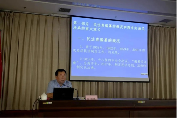 我所脱剑锋律师在轮训班上作了《中华人民共和国民法典》解读专题辅导报告,对民法典编纂的概况以及编纂与颁布实施民法典的重大意义、民法典立法体例、价值体系和基本原则、民法典各编的主要内容和制度创新等作了全面深入的解读。