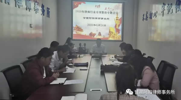 根据平凉市律师行业党委、平凉市律师协会关于律师行业专项整治活动的统一部署,结合甘肃阿阳律师事务所际情况,制定甘肃阿阳律师事务所专项整治活动实施方案,并于2020年8月24日组织召开专项整治活动动员会议,对专项整治工作进行了安排。
