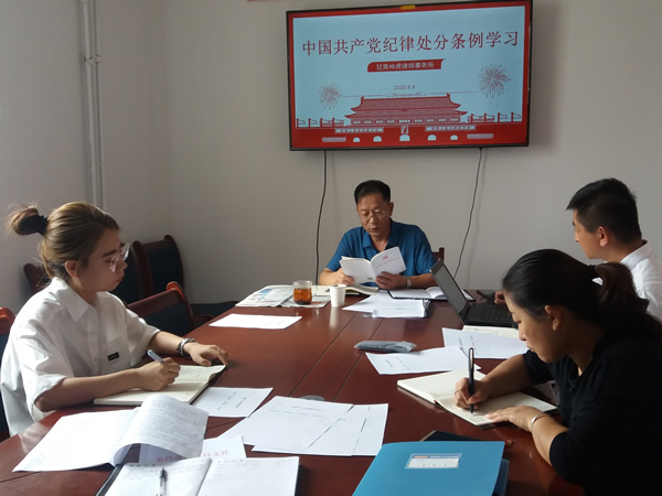 同时,在会议上由甘肃仲虎律师事务所主任毛忠湖带领甘肃仲虎律师事务所律师学习了《中国共产党纪律处分条例》等党内法规,以党员的行为规范为标准,提高政治站位,深刻剖析自身存在的问题,全面强化律师的政治思想水平。