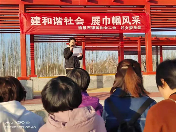 大江流日夜,慷慨歌未央。又一载春回大地,情暖三月,芳华飞扬,尽显巾帼风流。为了积极参与政治、经济、文化生活,主动承担社会责任,不断提高女律师的社会影响力。在2021年三八国际劳动妇女节来临之际,酒泉市律师协会工会、妇女工作委员会举办了“建和谐社会,展巾帼风采”系列活动。