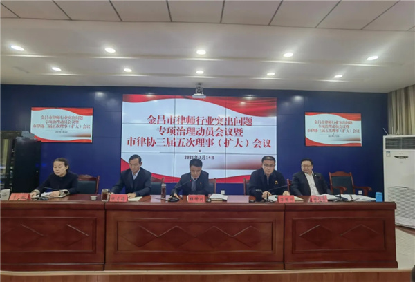 为认真贯彻落实全省司法行政系统队伍教育整顿动员部署会和全省律师、公证和司法鉴定行业突出问题专项治理部署会会议精神,3月14日,市律师行业党委、市律协召开了党委暨三届五次理事(扩大)会议,针对律师行业突出问题专项治理教育整顿进行了动员、部署、安排。金昌市司法局党组书记、局长杜仲川主持会议,市律师行业党委书记、副书记,委员,市律师协会班子成员、理事、监事,各律师事务所所主任参加了会议。