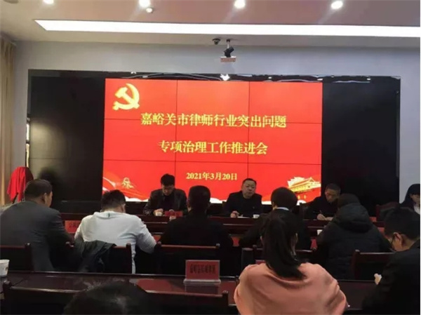 为认真贯彻落实全省司法行政系统队伍教育整顿动员部署会和全省、全市律师、公证和司法鉴定行业突出问题专项治理部署会议精神,2021年3月20日上午10时,中共嘉峪关市律师行业委员会、嘉峪关市律师协会在嘉峪关市司法局一楼会议室召开了嘉峪关市律师行业突出问题专项治理工作推进会。会议由嘉峪关市司法局党组成员、副局长、市律师行业党委书记郑浩主持,行业党委委员、各律所主任、公职公司律师工作委员会主任、律师代表30余人参加了会议。市司法局律师行业突出问题专项治理专班成员列席。