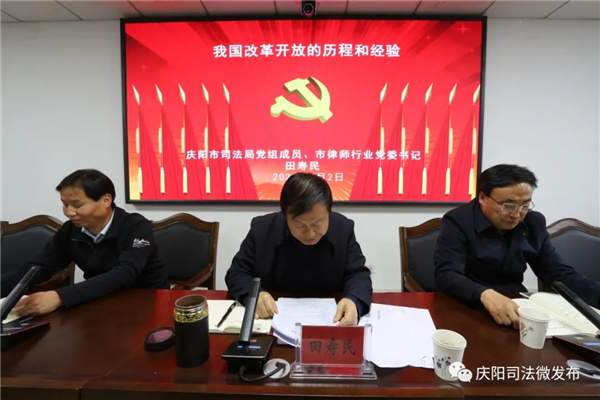 3月29日,庆阳市召开了市直律师事务所主任学习会,市直律师事务所主任、党支部书记、民主党派和无党派律师代表、市律师行业党委委员、市律师协会班子成员,市律师行业党委办公室工作人员、市律师协会秘书处工作人员、市局律师科工作人员共计38人参加会议。市司法局副局长、市律师行业党委书记田寿民同志出席会议,以“改革开放的艰难历程和经验”为题,为与会人员上党课。