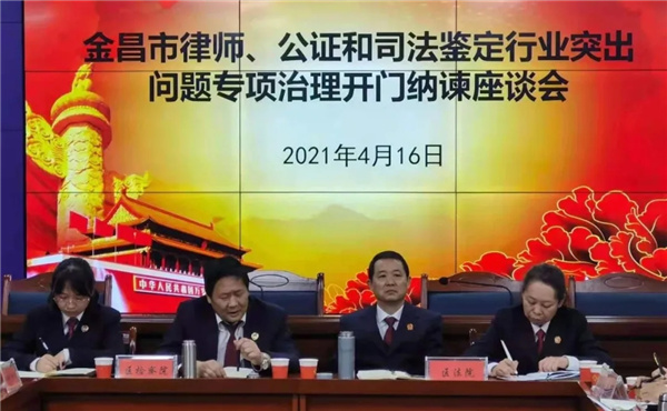 为进一步加强和巩固全市律师行业突出问题专项治理学习教育阶段成果,将学习成果融入到自查整改阶段,把我市律师行业突出问题专项治理的“规定动作”及“自选动作”做实做细做深,4月16日下午,金昌市律师协会召开我市律师行业突出问题专项治理工作座谈会,邀请市、区法院、检察院、公安局相关领导,人大代表、政协委员、人民陪审员以及服务对象代表共计20余人,广泛征求社会各界对我市律师行业及律师工作的意见和建议。市律师协会班子及全市各律师事务所主任参加会议,认真听取意见、建议。市律师行业党委书记万国川主持会议。