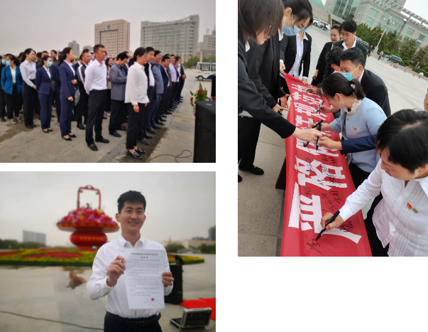 图片:左上:酒泉律师参与“严格依法规范执业,树立律师行业新形象”的教育活动启动仪式;左下:参加活动律师代表展示自己签署的承诺书;右:行业党委领导与律师一同在活动条幅上签名