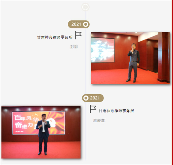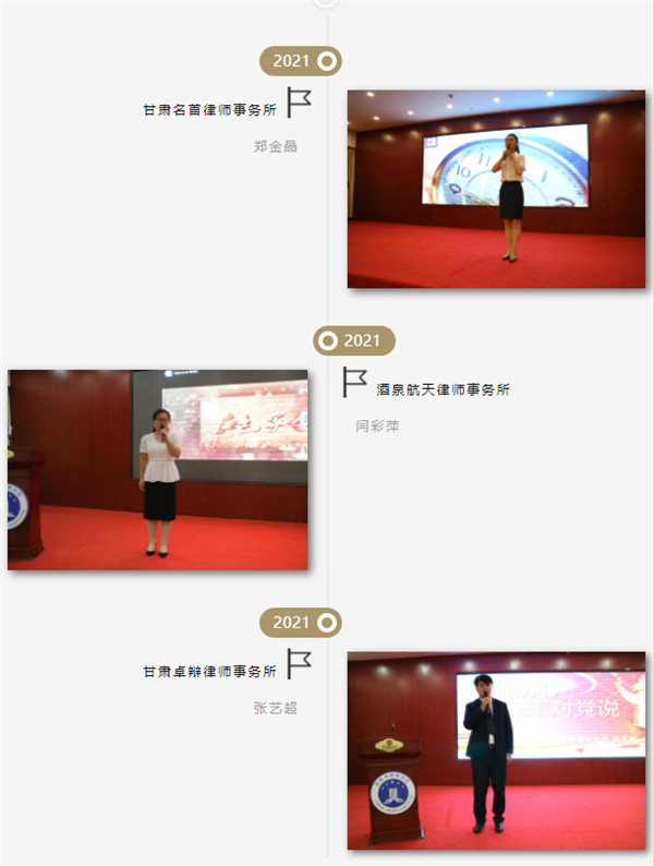 2021年是中国发展进程中一个鲜明坐标,为进一步促进全市律师深入了解党的百年历史,不断增强“四个意识”,坚定“四个自信”,做到“两个维护”,依规依法诚信执业,认真履行社会职责,由中共酒泉市律师行业委员会主办、酒泉市律师协会承办、酒泉市律师协会青年律师工作委员会协办的 “学习百年党史 汲取奋进力量”演讲比赛于2021年6月15日在东方国际大酒店成功举办,圆满结束。