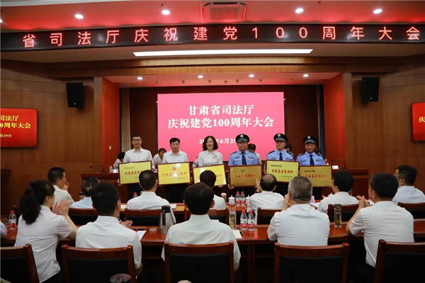 6月29日,甘肃省司法厅召开庆祝中国共产党成立100周年大会。大会在全体党员齐唱雄壮的国歌声中开幕。